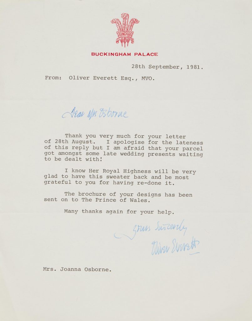 La storia è questa. Poche settimane dopo la famigerata partita di polo, Muir e Osborne ricevettero una lettera ufficiale da Buckingham Palace in cui si spiegava gentilmente che Diana avesse danneggiato il suo amatissimo maglione di pecora, chiedendone una riparazione o una sostituzione. Un nuovo maglione fu interamente lavorato a maglia e gli stilisti ricevettero in seguito un’ulteriore corrispondenza da Palazzo: una lettera di ringraziamento da parte del segretario privato di Diana, Oliver Everett CVO. Ed ecco la svolta: «Lo scorso marzo, mentre rovistavamo in soffitta alla ricerca di un vecchio modello, abbiamo notato una piccola scatola», raccontano i due stilisti. «All’interno, nascosto accanto a un copriletto di cotone, c’era il maglione di pecora rossa originale di Diana del 1981. Ora, a distanza di quasi quarant’anni, questo maglione a pecorelle unico nel suo genere è pronto per arrivare nelle mani di un fortunato collezionista».