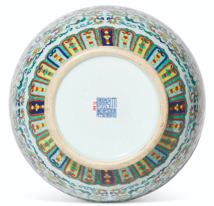 Colori sorprendenti e simbolismo di buon auspicio, con quel motivo ruyi che augura, secondo la tradizione, “tutto ciò che si desidera”. «Si tratta di un Doucai superbamente smaltato», rivelano da Christie’s, «con quattro fiori di loto stilizzati intervallati da altri piccoli fiori sopra gli emblemi dorati – il tutto […] delimitato da una fascia di petali e di pipistrelli stilizzati sopra le nuvole». Sono tanti gli elementi da interpretare, sul groviglio a colori della superficie: il fungo lingzhi, tra gli altri, che appare soltanto al cospetto di un sovrano virtuoso – chiaro omaggio a Qianlong, sovrano “illuminato”, degno della sua visione; e così ancora i pipistrelli, emblema di benessere, di felicità, tutti accalcati, bidimensionali, sopra un cielo in porcellana.