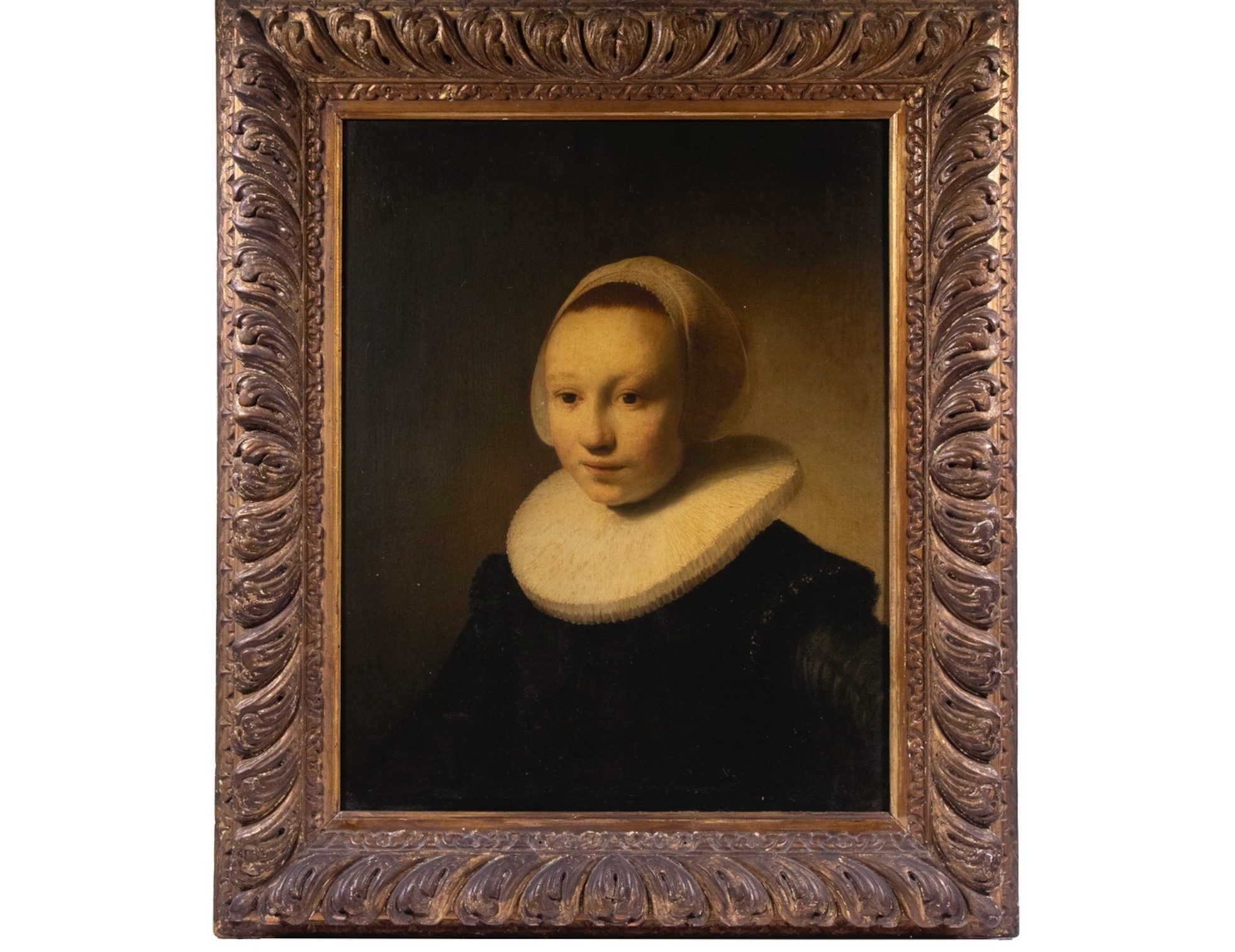 Il dipinto, realizzato su un pannello di quercia e accompagnato da una cornice olandese intagliata a mano e dorata, ritrae una giovane adolescente, vestita con un austero abito nero, in una posa che evoca la delicatezza e la profondità psicologica tipiche dei ritratti di Rembrandt. Il quadro, che non è firmato, risalirebbe ai primi anni ’30 del ‘600, periodo in cui il grande Maestro olandese aveva iniziato a prendere le sue prime commissioni importanti, per esempio dal principe Frederik Hendrik, in particolare nel genere del ritratto. A quel tempo, Rembrandt supervisionava le attività di uno studio ad Amsterdam insieme al mercante d’arte Hendrick Uylenburgh, cugino di Saskia Uylenburgh, che sarebbe diventata la moglie di Rembrandt.