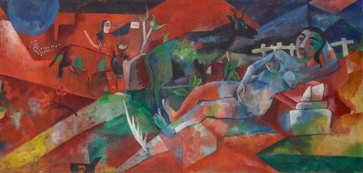Arriviamo a Liegender Akt, ad opera di Heinrich Campendonk, è il top lot del catalogo, i numeri qui schizzano a € 700.000 – 800.000. Ci sono un nudo femminile, una mucca, un albero, un’altra donna sullo sfondo, poi le linee diagonali, suggestioni di prismi e cerchi, tutti in mersi nel rosso, nel verde, nel giallo, nel blu. Una dimensione senza tempo, quasi un sogno sospeso. «Si tratta di un’opera che appartiene all’importante fase che durò dal 1917 al 1920», rivelano dalla maison. «Campendonk in questo periodo sceglie deliberatamente di vivere in isolamento per riflettere sui temi e sulle tecniche pittoriche del suo amico Franz Marc, che in quel periodo sviluppa in uno stile personale caratterizzato da forme dolcemente fluide e campi ampi di colore intenso».