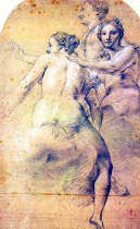 La serie di disegni si apre con le opere cinquecentesche di Giovan Battista Castello, detto il Bergamasco, artista poliedrico di ispirazione raffaellesca e di Luca Cambiaso. Quest’ultimo, tradizionalmente considerato l’iniziatore della scuola pittorica genovese, fu un grande sostenitore dell’esercizio grafico. Di entrambi vengono esposte opere che testimoniano la funzione preparatoria e preliminare del disegno alla creazione di dipinti, affreschi ed arazzi.