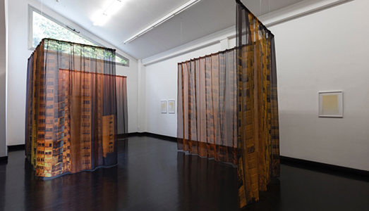 All’interno della galleria tutto si concentra in un’unica sala, dove lo spettatore diventa parte integrante dell’opera: viene vincolato a partecipare agli ostacoli che questo labirinto fluido crea, a muoversi per poterne fruire interamente. Le leggere installazioni si trovano in dialogo con diverse fotografie appese alle pareti realizzate attraverso l’utilizzo di una sostanza, che mediante la reazione del sole, crea sulla carta un effetto leggero, rendendo l’immagine unica, monocroma.