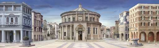 Fotografia e pittura ancora una volta assieme, a braccetto. Antiche sorelle che si osservano e continuano a dialogare, ad interrogarsi. Primo fra tutti il celebre dipinto attribuito alla scuola di Piero della Francesca, La città ideale, simbolo esemplare non solo dell’Umanesimo e della sua concezione antropocentrica, ma della nuova rappresentazione prospettica, di quel nuovo modo di concepire il mondo e quindi di dipingere che ha relegato in pochi decenni il Medioevo in un lontano passato. Emblema della prospettiva centrale rinascimentale su cui si basa appunto la costruzione dell’immagine fotografica, la fotografia stessa. Eppure a guardar bene, l’immagine non rappresenta più un’ipotetica città d’arte italiana bensì una commistione di tante London contemporanee, in cui è innanzitutto evidente il confronto tra la West e la East side. Lo stesso edificio centrale è costituito da più parti, appartenenti ai due volti della città, Londra che sta bene e Londra che sta male.