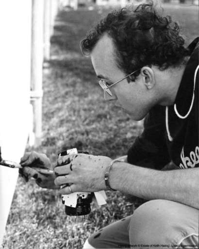 La sua breve vita (morì nel 1990, stroncato dall’Aids, a soli 31 anni), i continui arresti per l’attività –illegale- di graffitaro, la grande capacità di comunicare la sua voglia di fare arte per e con il pubblico –ecco spiegate le molte performance dal vivo– hanno contribuito ad aumentarne la popolarità tanto da consegnarlo al mito. Trasformando questo bizzarro artista nato nella profonda provincia americana in un marchio globale con la sua firma (declinata in cani, bambini, ballerini di breakdance) riprodotta a mo’ di gadget su magliette, cappellini e diavolerie varie.