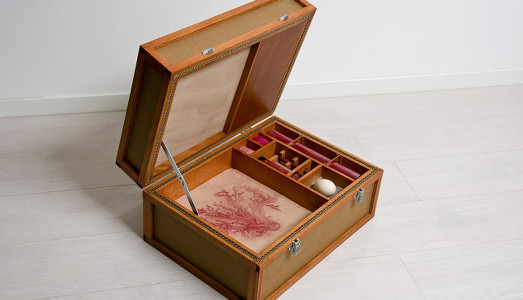 Nella seconda sala, sempre al piano terra della galleria, sorprende l’opera Ti vedo (2013): due specchi trattenuti da cornici volutamente leziose, che piacerebbero alla matrigna di Biancaneve, alle Sirene incantatrici, quelle che conducono alla perdizione nella voluttà e vanità, spiazzanti perché collocati in alto, dove non te lo aspetti, che si integrano con l’ambiente e definiscono una veduta angolare, “strabica”, giocata sull’inganno ottico, alterano la percezione al aldilà del ovunque. È un viaggio surreale negli abissi di un “mondo alla rovescia” con superfici d’acqua cristallizzati, specchianti che schiudono lo sguardo oltre la percezione dello spazio e il tempo dove naufraga la ragione, e qui l’Orfeo di Jean Cocteau troverebbe una dimora ideale. Ancor più strettamente legate alla raffinata “tenzone” tra lo spazio interno e quello esterno, tra l’io e l’altro, sono al piano interrato della galleria, dove l’installazione Inside (2015-16), composta da una serie di otto elementi apribili su appuntamento, tutti i mercoledì e i venerdì, si trasforma in un dispositivo di relazione tra il visitatore curioso e l’autore, a scatola chiusa. Così tra l’apertura di un contenitore e l’altro, si generano narrazioni di un tempo tutto da vivere più che da raccontare. I suoi contenitori, scatole, o meglio scrigni arcani narrano storie, invitano a perdetevi in una improbabile caccia al tesoro, immaginando l’isola che non c’è, in cui un uovo, un corallo, un pesce, abitante degli abissi, e altri elementi simbolici sembrano alla ricerca di senso, si fanno linguaggi di un inconscio, in cui l’enigma potrebbe essere una chiave d’interpretazione.