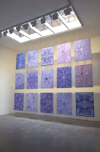 Nella prima sala cadono a cascata quindici tele, appese a un ponte di fili, tesi a partire dal soffitto. Racchiuse nel formato rettangolare si dipanano fioriture e forme vegetali che creano fitti intrichi e ramature. I colori tenui degli acrilici non cambiano di molto il loro proprio irraggiamento cromatico. Le scale timbriche, all’interno delle quali si muovono queste sofisticate inflorescenze, non escono dai toni aggraziati degli azzurri e dei violetti. Tonalità spesso compattate e contenute dalla minuzia dei contorni. Nella seconda sala, è di notevole impatto l’installazione Un mare di atomi. Una distesa di ventiquattro tele, ciascuna di formato 1×1,75 metri, s’irradia lungo le metrature degli spazi, restando parallela al pavimento. Azzeccata, qui, risulta l’illuminazione, che scende puntuale sulla superficie di ogni lavoro. La luce soffusa mette in risalto lo stampo geometrico e modulare di questi lavori, che mischiano alleli, in apparenza astratti, a reticoli mosaicati.