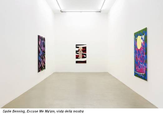 Kaufmann Repetto ha scelto nove opere del 2016, sulle cui superfici dominano prevalentemente colori accesi e mat, un effetto che l’artista ottiene dipingendo il legno con caseina e acrilico, donando un effetto di morbidezza tale da nascondere la consistenza del materiale originario. Tra i supporti colorati che Benning incastra tra loro, come per mettere in accordo parti di se stessa, compaiono in cinque opere dei personaggi crossdressed, ovvero vestiti in modo che non si riconosca il loro sesso. Si tratta di fotografie di disegni ingrandite che l’artista ha volutamente realizzato in maniera imprecisa e abbigliando le figure in modo da renderne impossibile la catalogazione sessuale. Sono personaggi dall’aspetto tribale, quasi totemico, un rimando ad una delle prime forme artistiche con le quali Sadie Benning aveva dato prova della propria vocazione artistica – il disegno – ma soprattutto presenze ambigue ed allo stesso tempo rassicuranti. Un binomio contraddittorio presente in tutte le opere della mostra che vogliono rappresentare la natura complessa dell’artista rincuorando lo spettatore con colori vivaci e l’intrinseca fragilità dei disegni tratti dai suoi notebook. Ad esempio in Excuse Me Ma’am, opera che dona il titolo all’intera esposizione, i capelli della figura centrale paiono una colonna che la sorregge, e che probabilmente rafforza la volontà dell’artista di porsi nei confronti del pubblico in tutta la sua schiettezza ed al contempo non fornisce riposte troppo precise, o che perlomeno non rispettano gli schemi della vita comune.