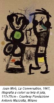 Chagall si trasferisce a Vence nel 1949 e per la Fondazione realizza un enorme mosaico, Les Amoureux (1964-67), di cui è presente in mostra l’acquerello preparatorio. Due personalità antitetiche, le cui opere, del tutto inedite per l’Italia, vengono accostate in quest’occasione creando due percorsi di visita godibili separatamente. Le circa novanta tra litografie, acquatinte e acqueforti di Joan Miró rendono conto di quarant’anni di lavoro: dal 1938, anno della Serie nera e rossa, al 1981, data dell’incisione Miró Milano, una delle opere esposte appartenenti alla Fondazione Mazzotta, realizzata dall’artista per la città meneghina in occasione della monografica allestita in suo onore in quell’anno.