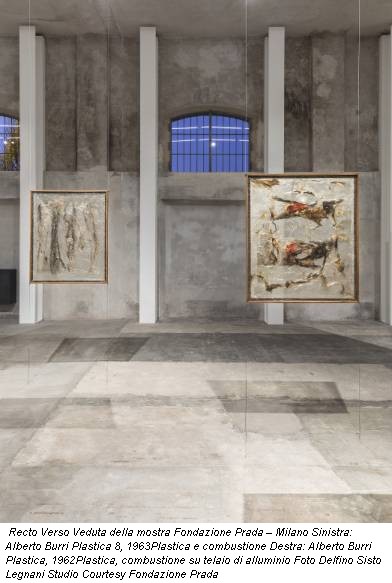 “Recto Verso” è proprio il titolo dell’agile esposizione che la Fondazione Prada presenta – fino al 14 febbraio – nella galleria Nord dei suoi spazi milanesi. Anteprima il 2 dicembre, si chiude il 14 febbraio. Un tempo un po’ contratto, che tuttavia merita inseguire per lasciarsi sedurre dagli inviti dichiarati degli autori ad apprezzare anche il “lato-B” delle loro creazioni, declinato secondo vari punti di vista e lettura critica. Per esempio, andando indietro nel primo Ottocento di Louis-Léopold Boilly, con il trompe-l’oeil del gattino goloso che, volendo arraffare un’aringa, rompe la stessa tela nella quale è raffigurato. Effetti d’inganno più aggiornati nell’inconfondibile disegno colorato di un retroquadro di Roy Lichtenstein; oppure, proiezioni simboliche di altre suggestioni, di altri concetti, simmetrici e complementari, come ad esempio nel doppio Giulio Paolini con tre triangoli sovrapposti a formare sagome stellate che paiono alludere alla forma-simbolo dell’antico sodàle Zorio. O, ancora, rapporto fronte/retro, dato evidentemente per scontato il taglio fontaniano, come penetrazione nella trasparenza spaziale della bidimensionalità nelle combustioni di Alberto Burri, presenti due begli esempi di inizi anni ‘70, gli stessi dei sicofoil di Carla Accardi (Grande trasparente e Grande oro); trasparenza che compete anche al vetro di Pierre Toby.