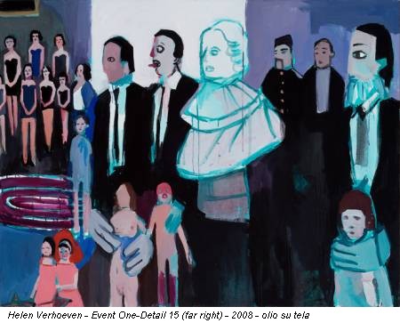 Stravolge la logica prospettica dello spazio Helen Verhoeven, con gesto spontaneo e ingenua stilizzazione delle figure, per un’analisi del linguaggio surrealista. Scene frammentarie – che indagano concetti come vita e morte, attesa e partenza – strutturano una pittura anti-narrativa dalle campiture piatte con sgocciolature annesse, ispirata da immagini selezionate dalla Rete.