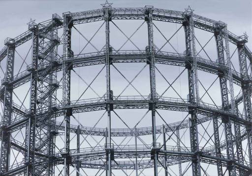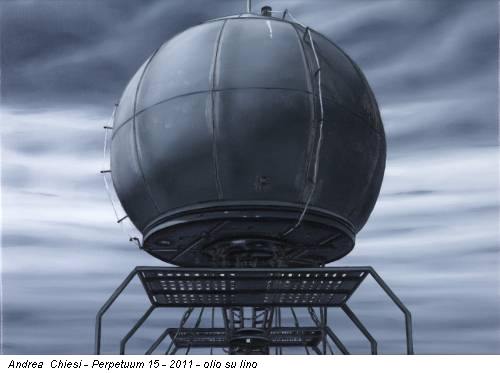 Andrea Chiesi (Modena, 1966) ha soggiornato a Berlino in diverse occasioni, nel 2011 ha vissuto in uno spazio sperimentale a Kreuzberg dando vita ad una serie di opere intitolate Perpetuum mobile, di cui sono in mostra tre dipinti: still life di luoghi urbani dai toni metallici, raggelanti, in cui nero, bianco e virate di grigio trasparente, rappresentano, con linee essenziali, edifici di archeologia industriale; tra questi, spicca un gasometro a sud di Berlino, più surreale che iperrealista, decorato con enigmatiche insegne luminose. Emana un’energia ipnotica, poi, l’opera con un radar a forma sferica, situato in un aeroporto abbandonato, nei pressi di un lago simile a una navicella di Star Trek sperduta in uno spazio fuori dal tempo: certamente un omaggio alla fotografia di Bernd e Hilla Becher e a Gerhard Richter, padre della pittura fotografica.