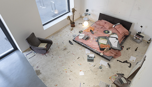 La storia (forse) di una donna che, reduce da un viaggio (da una valigia trabocca un capo di biancheria intima), è giunta nella dimora del suo amante, a sua volta amante della buona musica italiana (tanti i vinili da Dalla a Modugno a Milva) così come della scrittura (si vedano le lettere, la Olivetti 32, i versi poetici e manoscritti sulle pareti) e delle caramelle. Sono le cartine di queste a creare un trasandato ricamo sulla moquette un tempo bianca e ormai “negativo” di tracce, di orme, di vino, di cenere. E qui torna la consumazione, richiamata dai resti di qualcosa che è bruciato: la sigaretta, come la passione che si suppone consumata sul talamo fulcro dell’opera, in cui si concentrano gli indizi per l’apparente soluzione di questo rebus/giallo.