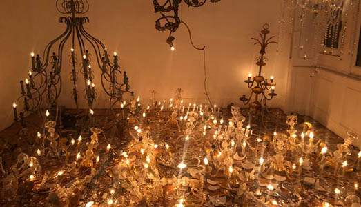 seguono attenti i discorsi appassionati dei collezionisti suscitati dalla sua prima mostra personale a Milano. In sottofondo, il suono grave dei rullanti allestiti in cerchio offre un’atmosfera di antico rituale. Un po’ più in là, un riflesso ambrato si dissemina oltre i cristalli dei lampadari ridotti a pezzi e sparsi sul pavimento. Uggiolando, un uomo colpevole e abbattuto musica parole di odio e dolore offrendo la vita in sacrificio.