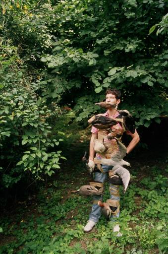 ragazzo rimane a guardare il cielo, avvolto da uccelli impagliati e attaccati al