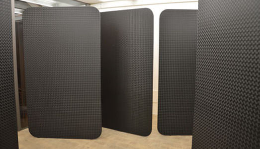 Appena entrati nella galleria lo spiazzamento è immediato, ci troviamo davanti ad un’installazione di otto pannelli di legno rivestiti di un materiale, comunemente denominato “mollettone”, ed utilizzato per il rivestimento dei tavoli di ambienti interni. Inoltrandosi il visitatore è chiamato a scovare dietro queste lastre le opere d’arte realizzate dall’artista.