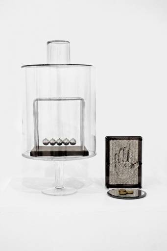 Il bianco, unito alla vitrea trasparenza, diventa portatore della complicazione del pensiero psicanalitico in un gioco di contenitori e contenuti. Algido metallo e vetro si uniscono per ridare vita a Isaac Newton; un paio di dadi da gioco – il cui colpo non abolirà mai il caso – sono la raffigurazione del prodigio di Albert Einstein. Scienza e religione si fronteggiano e si mischiano, senza conflitti, perché, come sosteneva Eraclito, “quest’ordine universale, che è lo stesso per tutti, non lo fece alcuno tra gli dei o tra gli uomini, ma sempre era è e sarà fuoco sempre vivente, che si accende e si spegne secondo giusta misura”.