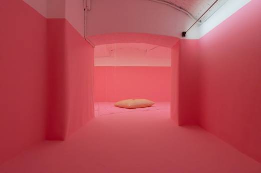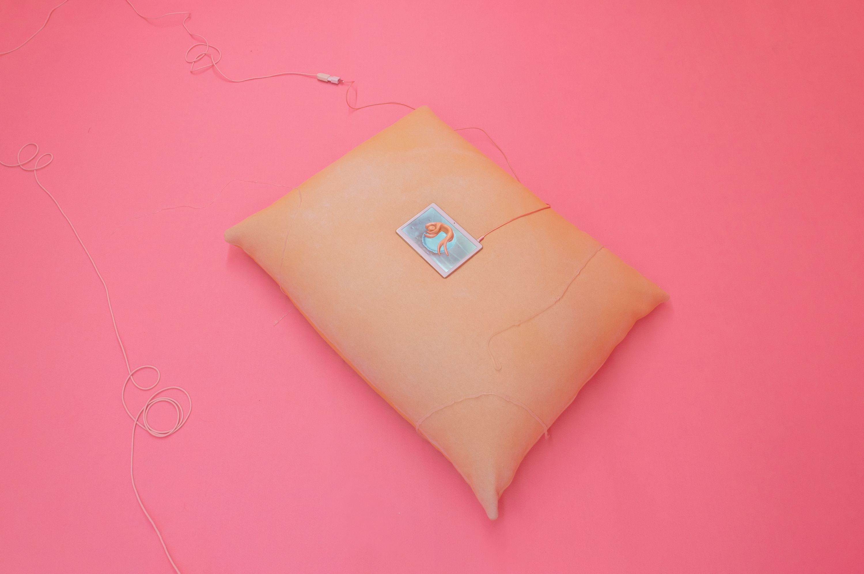 Nella mostra si entra attraversando strutture organiche e malleabili nella tonalità pastello, e il display espositivo unisce opere realizzate con diversi materiali, come argilla modellata e smaltata, felpe, tessuti stampati, pittura, pigmenti, colla vinilica, silicone, detersivi e ammorbidenti; con media come video, scultura, audio e pittura.