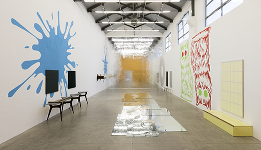 La parete gialla con pois blu Untitled si rispecchia in una dimensione parzialmente offuscata nella carta argentata adesiva posta esattamente nella parete frontale opposta. Lateralmente, le installazioni composte dai vari oggetti assemblati sono posti davanti alle due chiazze di colore azzurro acceso “spalmate” sui muri bianchi. È un susseguirsi di giochi, elementi e colori che accolgono piacevolmente lo spettatore dall’ingresso nell’enorme sala. La maestria di questo grande artista si dimostra dall’opera più semplice alla più complessa: ogni cosa è arte, ogni opera è ironia e libertà che si traduce infinitamente nei suoi lavori.