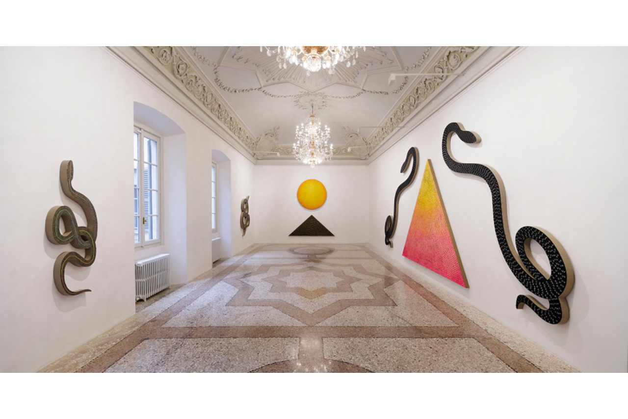 ispirati alle fasi lunari, come il titolo della mostra evoca. Jennifer Guidi per l’esposizione milanese ha instaurato un dialogo tra l’architettura neoclassica e rigorosa di Palazzo Belgioioso dai motivi geometrici delle decorazioni secondo i principi della simmetria di Vitruvio e le sue opere dalle proporzioni idealizzate, rielaborando i principi vitruviani Firmatas (forza), utilitas (funzionalità) e venustas (bellezza). Guidi ha realizzato grandi tele a forma di serpente come una personale rivisitazione visiva e materica di energia kundalini che si muove attraverso i sette chatra e si irradiano illuminando il terzo occhio al centro della fronte del serpente.