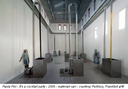Glicerina, vino rosso, caffè espresso, sapone liquido, olio d’oliva, inchiostro nero, asperula, latte, tonico per il viso avevano già invaso le sale del Portikus, diretto da Daniel Birnbaum a Francoforte sul Meno, risaltando in un contrasto tra l’artificialità delle sostanze che sgorgavano dalle fontane e la semplicità del fiume che circondava la sede espositiva. Ciononostante, anche a Milano, in dialogo con la periferia post-industriale, non perdono la loro forza espressiva e spettacolare. It’s a cocktail party, cheers!