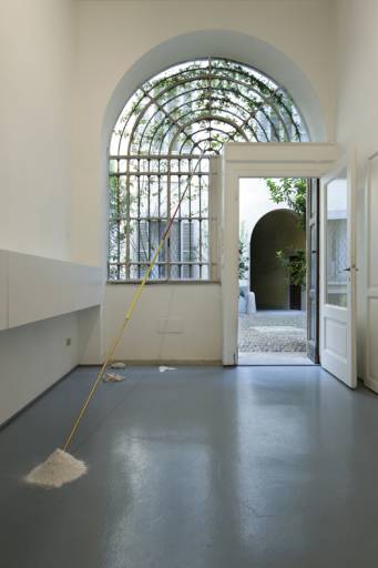 Se, quindi, forme ottagonali, disegni, tubi in alluminio, gesso, carta, farina e marmi sembrano riempire solo alcune porzioni di stanza, l’intenzione associativa ed esploratrice che lega le sculture installative assume su di sé una riflessione interiore che non ha più nulla a che vedere con un riflesso formale e con le scelte caravaggiane di ideazione reale. Grazie agli scambi tra organico e inorganico, tra la luce e il buio, tra il paesaggio e il suo mistero, la posizione dei materiali, spinti verso terra, si sottrae alle leggi che intaccano la prevedibilità della superficie.
