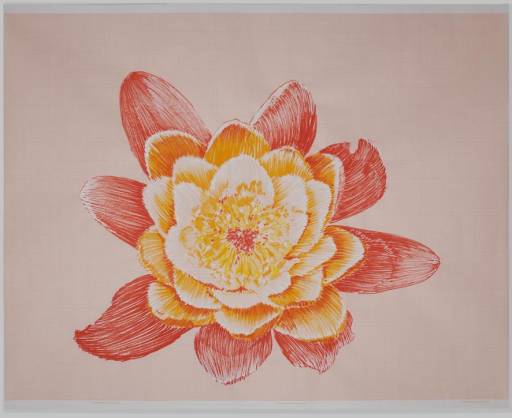 fattura. La ninfea, l’ibisco e il fiore rosa si adagiano sul materiale