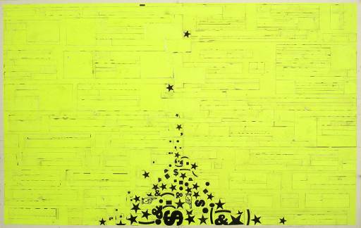 Superata la negazione pura e banale dei primi lavori, nelle opere recenti l’artista elabora un’estetica del segno tipografico paragonabile all’atto di Twombly di dissolvere le parole in scarabocchi carichi di una nuova forza espressiva. Indipendentemente dal media utilizzato, a partire dal cemento con cui viene forgiata l’installazione a pavimento concepita site-specific per gli spazi della galleria, alle serigrafie fluorescenti a tiratura unica che divengono scultura, fino ai collages, piatti e crudelmente grafici, realizzati intagliando a bisturi i manifesti utilizzati per pubblicizzare gli eventi locali, affissioni pubblicitarie low cost dal font robusto e anonimo caratterizzate dallo sgargiante pragmatismo, molto diffusi nel sud della California, Christopher Michlig attua sistematicamente la messa in scena del non-linguaggio, in grado di scatenare le possibilità latenti derivanti dalla piacevolezza sottovalutata dei segni d’interpunzione.
