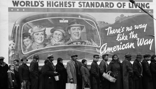 Pervasi da una sorta di malinconia verso gli anni d’oro del reportage, della fotografia come documento, del bianco e nero e della stampa illustrata, ci lasciamo cullare da questi scatti. Incontriamo diverse figure femminili come la pittrice Georgia O’Keeffe o la fotografa Margaret Bourke White, immortalata al lavoro in bilico sul Chrysler Building. Fu proprio Margaret Bourke White a firmare la prima copertina storica che ben definisce le contraddizioni dell’America anni ’30: una serie di uomini e donne di colore in coda fuori da una stazione di soccorso, con alle spalle un cartellone che pubblicizza il sogno americano.