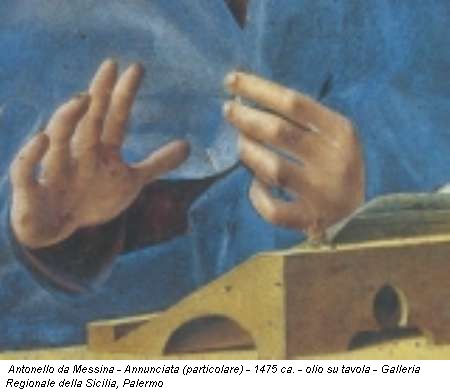 Annunciata di Antonello, più della perfezione assoluta della forma, è la dimensione psicologica che la rende viva e reale. Lo sguardo enigmatico -dove e cosa guarda la Madonna?-, le labbra appena increspate da un accenno di sorriso, la reazione contrastante delle mani, con la sinistra che stringe il manto quasi intimidita dall’improvvisa apparizione dell’Angelo, e la destra che si distende decisa in avanti -Longhi la definì “
