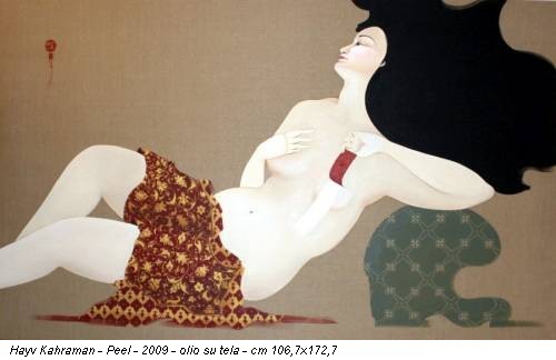 raffinata donna-manichino che si scarnifica, dell’irachena Hayv Kahraman – con riferimenti all’arte sumi