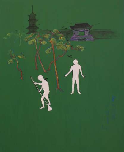 Il primo viaggio in Europa del pittore Zheng Zaidong (Taiwan, 1953; vive a Shanghai) approda presso la Galleria Curti/Gambuzzi di Milano. L’artista fa da tramite a una figuratività decisamente orientale, ma capace di incontrare con grande semplicità il gusto dell’Occidente. Rimangono dunque evidenti alcune caratteristiche del modo rappresentativo tradizionale: la disposizione sulla superficie in senso verticale, senza profondità anche quando sono suggeriti piani diversi; le figure stilizzate ma ora più sommarie, prive della minuziosità della grafica orientale, di cui rimangono tuttavia i temi classici (persone, alberi, case, arredi); la presenza di ideogrammi accanto ai soggetti dipinti, brani di antichi poemi cinesi che ricorrono anche nei titoli. Si tratta di tele permeate da un profondo lirismo, rivitalizzate dalla presenza dei colori intensi, saturi degli sfondi -soprattutto i verdi- e dalle grandi dimensioni delle opere.