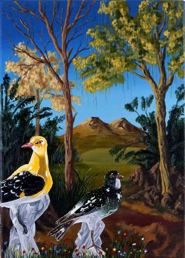 E vi si integra quasi perfettamente. Ma in alcuni casi il referente umano si fa ritratto, si fa visione di individuo che dorme, che si perde languidamente tra il prato e le foglie, che sogna l’impossibile. Oppure, semplicemente, che sorride da un divano rosso, come da vecchia scuola renoiriana. Una pittura eterea, smorzata, e vagamente d’altri tempi che fa da contraltare ai lavori onirici di Ozbolt, artista croato e inglese d’adozione. Il suo è il mondo visionario del Doganiere Rousseau. È un mondo di sogno, naïf, irreale, che tratteggia con colori saturi improbabili scenari esotici, direttamente tratti dal mondo delle fiabe d’avventura. Giungle incantate, grotte misteriose, animali sconosciuti, vulcani e pianeti al limite del reale colpiscono con tutta la sfacciataggine che manca a Di Pasquale, e intrecciano una densità di riferimenti solo apparentemente ingenui. Fino a tratteggiare un immaginario favolistico in bilico tra l’adulto e il bambino, a tratti inquietante, a tratti dolce-amaro. Due diverse visioni del mondo, l’una più immediata, l’altra più cerebrale. Due diversi pensieri sulla realtà. E chissà dove sta il vero.