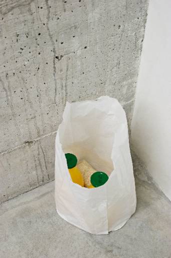 Ad accogliere il visitatore, un lavoro impalpabile, quasi assente: un sacchetto di carta con all’interno un pacco di riso e bottiglie di succo di frutta. Un vero e proprio totem della quotidianità, il cui senso è il più semplice e universale possibile: prodotti di diffusione planetaria che diventano simbolo di una globalità quasi impossibile da trovare a livello culturale. È la seconda proposta, però, a colpire maggiormente. In bilico fra installazione minimalista e objet trouvé, metaforicamente collocata nell’unico punto della galleria pienamente rischiarato dalla luce naturale, si trova tutto il sistema d’illuminazione dello spazio, smontato dalla sua destinazione d’uso e ricollocato in chiave estetica; lasciando in penombra la galleria ed esibendo, ancora una volta, oggetti d’uso comune.
