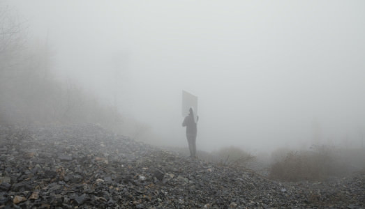 Un altro tipo di approccio utilizzato dall’artista per entrare – letteralmente – in contatto con la natura è quello utilizzato recentemente negli Ascolti, tre fotografie – Ascolto#1, Ascolto#2, Ascolto#3 – in cui utilizza e “indossa” un Sound Locator, il primordiale radar costruito tra fine Ottocento e metà Novecento, per udire suoni provenienti dal cielo; durante la Prima Guerra Mondiale furono usati per stanare l’arrivo del nemico su dirigibili e aeroplani. Lo strumento, qui ricostruito, assomigliante a una vera e propria tela pittorica bianca, copre completamente gli occhi, impedendo alcuna visuale e permettendo di focalizzarsi sull’uso dell’udito. Pedrini è raffigurato mentre lo indossa, negando a se stesso e ai fruitori il proprio sguardo, per stare in ascolto all’interno di tre luoghi completamente diversi, tre paesaggi isolati che ci ricordano un romantico approccio di stupore da parte dell’artista di fronte all’immensità della natura. Un elogio al sublime dal sapore kantiano, che verte il dito verso l’essere in potenza, in cui soggiace quella forza esplosiva dal potenziale creativo.