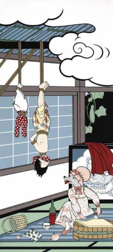Asuka Ohsawa (Torrance, 1973; vive a New York) attinge allo stile giga (l’illustrazione umoristica) della tradizione giapponese, alle stampe del “mondo fluttuante” di Hokusai ma anche alla più contemporanea cultura superflat. La sua è una ricerca dove stilizzazione ed essenzialità della linea traducono una riflessione sulla condizione femminile incarnata da una Cappuccetto rosso stile pin-up che ammalia e sgomenta al tempo stesso. In un’ambientazione surreale, che trasfigura il bosco nell’imponente veduta del monte Fuji e restituisce una visione della società contemporanea animalesca, dominata da un atteggiamento voyeristico, impregnata di violenza ed erotismo.