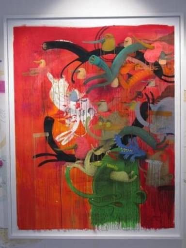 Le divertenti creature nate dalla mano di Alexone (Parigi, 1976) debordano oltre il canovaccio della grande tela Big Paper, per rincorrersi – colorate, irriverenti, leggere – verso i lati della parete, quasi in segno di delicato sberleffo.
