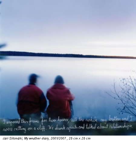 In My Weather Diary (2001-2007) gli scatti di Jari Silomäki colgono momenti, sensazioni, emozioni fugaci e irrepetibili della sua vita, rendendoli immanenti. Lo spettatore impara a conosce la finestra da dove il fotografo ammira la sua città, il suo quartiere, conosce i suoi vicini, la sua famiglia. Viaggia con lui tra New York, Londra, Graz e Kabul. Il suo diario perenne diviene memoria della sua intimità ma anche memoria della storia contemporanea dell’umanità, inneggiante alla pace mondiale e alla bellezza straordinaria e unica della vita: “…the best hope for peace in our world is the expansion of freedom…”.