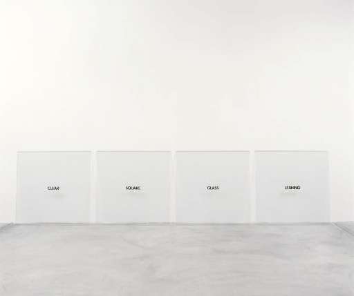 Di grande condensazione concettuale, ed esattezza operativa, anche Clear Square Glass Leaning (1965). Nella seconda stanza delle scuderie, quattro lastre quadrate di cristallo, giacciono in fila, appoggiate al muro. Su ognuna è applicata una parola, una qualità referenziale del pezzo in sé (chiaro, quadrato, vetro, sporgere) che eleva il significante formale a significato speculativo. Con quest’opera Kosuth innesca un’indagine autorappresentativa che connota e concentra nella lingua la capacità e lo spessore estetico dell’opera d’arte.