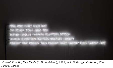 Il lavoro, infatti, proietta su se stesso il nome primordiale della materia, riverberando quel potere semantico che diventa definitorio e assoluto allo stesso tempo. Ancora da visitare, nella terza stanza, Five Five’s (to Donald Judd) (1965), un esempio classico della produzione e del dibattito kosuthiano. Così, sotto le luci slavate del neon, chiude la veloce retrospettiva di Villa Panza, ripetendo nella luce, una serie di numeri che smettono di contare per cominciare a parlare di parole, parole, parole e di nuovo parole.