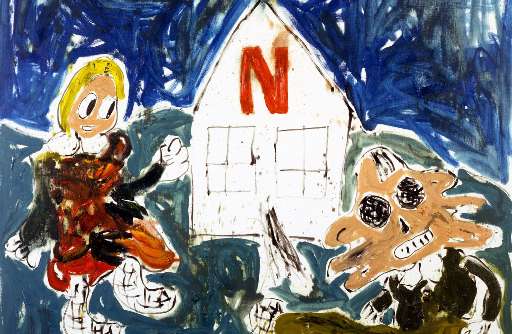 Il dipinto a olio, che prende il titolo dall’esposizione stessa, mostra una casa schematizzata, costruita unicamente dall’incontro tra un triangolo e un quadrato. Sul frontone campeggia una grossa “N” che sembra in procinto di prendere fuoco. Una casa che, con il suo candore, emerge quale salvezza al centro di una composizione trasfigurata dal colore. Ma non c’è porta e non c’è quindi accesso, anche quel vialetto fortemente scorciato che vi giunge è uno scarabocchio. Ai suoi lati un uomo e una donna che, nei tratti, ricordano il primo Disney. Lei indica la casa incuriosita, ma si scontra con il muro di silenzio dell’uomo seduto sulla destra, atterrito.
