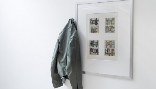 La disciplina pittorica si ritrova più volte proposta nei diversi lavori esposti tra i due piani della galleria vicina alla stazione di Cadorna. In Senza titolo: guanti in finta pelle (2014), Vanni interroga la pittura e la sua (in-) capacità di finzione, rappresentando dei guanti neri che si scontrano con la bidimensione della tela; nel dittico Ritratto di pane d’argilla e Ritratto di piano d’argilla per bassorilievo (2014) l’artista rappresenta, di nuovo attraverso l’ausilio della pittura, due passaggi per l’elaborazione di un piano in argilla. Materiale della scultura per eccellenza, l’argilla viene immortalata quando ancora non ha assunto una forma estetica, viene resa nella sua natura grezza e cruda per mettere in luce il percorso manuale e preparatorio che ne consente la trasformazione. Esposti sulla stessa parete, queste due opere sono completate da Phango (2014), un lavoro realizzato attraverso l’impiego della tempera all’uovo all’interno di una bomboletta spray, usata da un graffitista chiamato appositamente per firmare il muro della galleria. L’incontro della tempera all’uovo, il suo carattere nobile e raffinato, con uno strumento contemporaneo utilizzato per i graffiti di strada, matrice dell’atto vandalico, testimonia la capacità di reinterpretare i modi operandi della storia dell’arte, di stravolgerli, di straziarli per immaginare usi inediti e nuove pratiche artistiche. In Ritratto di giovane ragazzo: preparazione verde per incarnato (2014), l’artista dipinge direttamente una giacca di pelle con il verdaccio, il colore della tavolozza utilizzato per l’incarnato delle figure, per mostrare ed esplicitare ciò che non si vede e che si nasconde solitamente “sotto la pelle della pittura”. L’opera è rafforzata dall’associazione della giacca con un rettile, un geco, e con la sua naturale necessità di trasformarsi, perdere e cambiare la pelle.