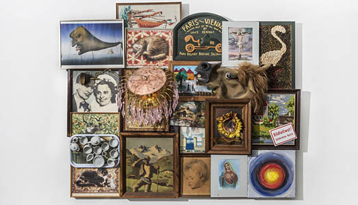 Nella mostra “Was Bleibt” la Fondazione Mudima ospita circa trenta opere inedite realizzate nel corso del 2016: a seguito della sua profonda fascinazione verso i mercatini dell’usato di tutta Europa – marchés aux pouces – per cui è solito passeggiare, l’artista recupera direttamente gli oggetti che restano sulla strada, caduti dalle bancarelle o abbandonati dai mercanti alla fine della giornata di lavoro. E così bambole, quadri, utensili da cucina, attrezzi da giardinaggio, bigiotteria, fiori finti, cocci, tappi, fotografie, gabbiette, grucce, strumenti da disegno, maschere africane, statuine, lampade, abiti dismessi, peluche, parti di elettrodomestici, chiavi, cartoni, appendiabiti: una miriade di oggetti, impossibili da catalogare, che entrando nell’opera mutano di status e vengono considerati non più per la propria valenza materiale quanto immateriale. “Spirituale”, si potrebbe definire il mistero che le accompagna, poiché le storie che portano con sé, a tutti sconosciute, sono un crocevia di luoghi, tempi, culture, generazioni, usi e disusi.