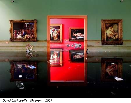 Poco importa che questi ultimi cicli siano i meno riusciti del corpus di LaChapelle. L’estetica low-fi di Recollections è stata sperimentata con migliori risultati da decine di fotografi negli ultimi anni e il Diluvio risulta pretenzioso e lezioso, eccessivamente “integrato”, in un certo senso. In ogni caso, queste serie gettano una luce retrospettiva sulle notissime foto precedenti. LaChapelle attira le star in una trappola falsamente celebrativa, e le deturpa. Rende evidente la loro natura di veicolo degli oppressivi dettami della società dei consumi. Il sesso risulta essere spersonalizzante anestesia (un’“arma di distrazione di massa”, come verga sulle sue tele la giovane pittrice Eloisa Gobbo). Non si tratta però di sermoni pseudo-politici. LaChapelle esagera i tratti visivi della nostra società, trasforma lo scintillante in disgustoso tramite la ridondanza. Allestisce come un’orgia di colorati fluidi corporei che diventa nauseante. Mai critica indiretta fu più efficace: quest’ambiguità critica situa il fotografo tra gli eredi diretti della Pop Art, con cui condivide fini e mezzi, seppure aggiornando questi ultimi.