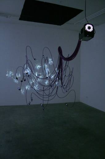 Intervallate da un continuo scambio metaforico tra il mondo della macchina e quello dell’uomo, in mostra sono esposte cinque installazioni, cinque enormi gomitoli intessuti di fibre ottiche, come icone e simboli dell’esasperazione elettronica. Attorte eppure affilate, allungate da parete a parete e composte di fibra ottica, questi cinque multi-proiettori composti dalla fibra ottica riprendono le sperimentazioni passate e le proiezioni già realizzate per horror vacui, digital hide oppure per other geologias. A vederle somigliano a molteplici foreste inesistenti, insediamenti sospesi di mangrovie industriali, zolle di cavi che, proprio come l’uomo di oggi, hanno cominciato a confondere le proprie radici con i loro stessi rami, i segnali della loro continua, confusissima crescita in espansione.