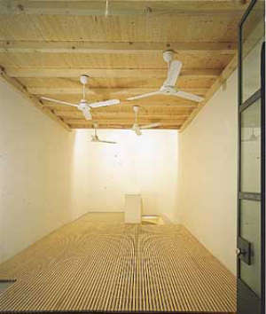 Tre ventole girano a vuoto nella stanza d‘accesso alla galleria. L’ambiente ricoperto nelle superfici orizzontali da legno chiaro è estremamente pulito ed elegante. Il vuoto non è ampliato dal silenzio, anzi è riempito dalle note del famoso pezzo di Elvis Presley, Love me tender. Così quest’aria da saloon abbandonato trova nel titolo Tutto il tempo che ho sprecato un profondo pentimento, un ammonimento, una coraggiosa presa di coscienza probabilmente alimentata dalla frenesia e dall’efficienza sempre attiva della vita milanese.