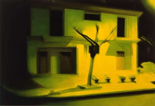 La storia di una casa, la sua presenza in sogno, l’architettura della memoria, nessun punto di fuga. Sei dipinti notturni riprendono sparizioni e apparizioni. La realtà va immaginata, altrimenti non si racconta…