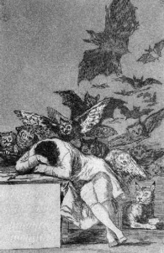Tutta la sua produzione grafica è una trasfigurazione fantastica di una realtà umana che l’artista osserva con spregiudicata libertà. Il genio di Goya attinge spesso al buio dell’inconscio e Il sonno della ragione genera mostri è l’opera che meglio sintetizza la sua poetica. Strenuo difensore dell’illuministica ragione, l’artista vede nell’irrazionalità il deterioramento della morale e considera l’uomo un essere in sospeso tra la ragione e l’istinto, ma dotato di quel libero arbitrio che elimina ogni possibile attenuante etica alla corruzione umana. E l’uomo che decide di abbandonare la ragione per cedere all’istinto, per Goya, non ha scusanti.