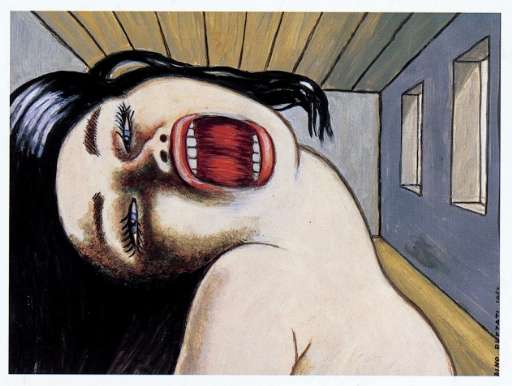 Certo, la qualità e l’inventiva della pittura di Buzzati possiedono un valore assoluto. Eppure la mostra rende evidente che Buzzati scriveva anche con il pennello. Si tratta in effetti di una mostra più da leggere che da vedere: sia per la gran mole di documenti e di testi messa a disposizione del pubblico, sia perché Buzzati dissemina le sue opere di frasi e didascalie, mescolando il linguaggio pittorico con quello dell’illustrazione e del fumetto. La circonvoluta calligrafia dello scrittore accompagna in un rapporto simbiotico le immagini. Si tratta d’altronde di un rapporto biunivoco: difficile leggere le pagine di Buzzati senza visualizzare la sua Milano notturna e da incubo, i suoi personaggi metafisici, dal Colombre al Babau.