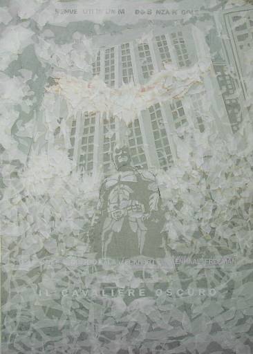 Tra i poster remixati, l’imponente sagoma di Batman nel collage Cavaliere oscuro, con il suo interessante effetto papertiger, viene esposto alla stregua di un preparatorio o di un attrezzo di scena. Un approccio pop ortodosso, quello di Mastrovito, che lavora sulle icone e sui processi di metabolizzazione dei tormentoni, come conferma il playback grottesco del concerto di Wembley dei Queen di Queen + Gbmms – A photocopied Concert.