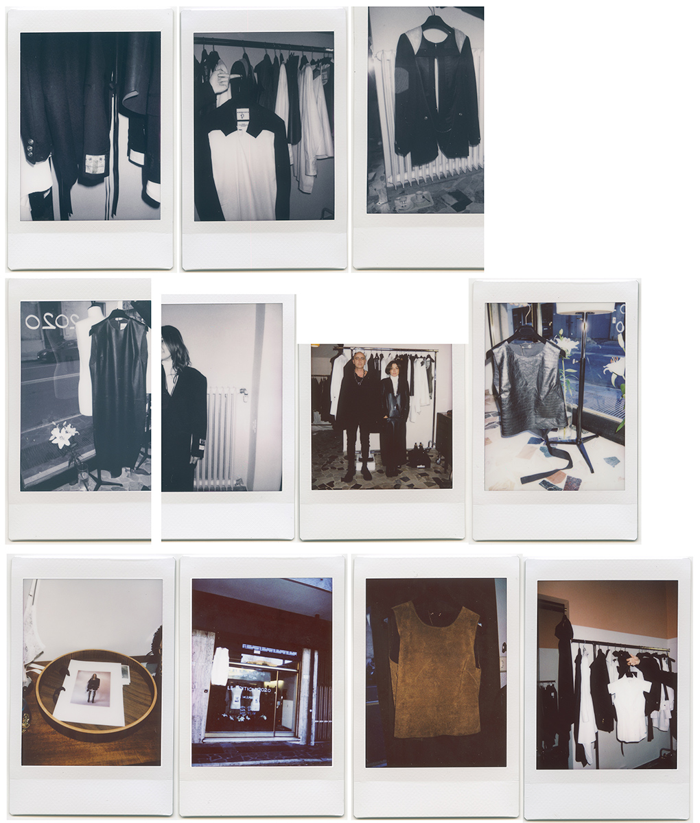 Sabato, 7 dicembre, ore 12:30. Erika Cavallini con le sue Tabi boots passeggia parlando al telefono all’interno di E-Studio, in via Grimelli, Modena. Sulla saracinesca è appeso un abito bianco e i manichini esposti in vetrina fungono da cornice alle due immagini appiccicate con lo scotch. Il perimetro del negozio è tracciato dagli abiti di archivio di Luca ed Erika. Missoni, Dries Van Noten, Yves Saint Laurent ed Erika Cavallini Semicouture, l’autentica.